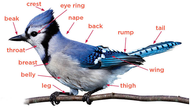 There are about 10,500 species of birds in the world. Sometimes it’s easy to identify a species, and sometimes it can be hard to tell two species apart because they look so much alike. Scientists and birdwatchers start the process of identifying a bird by paying attention to its field marks—characteristics like colors, markings, size, shape, and even sounds. Take a look at this Blue Jay and its field marks.